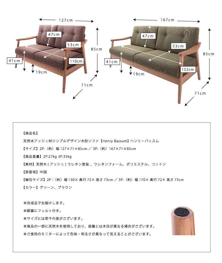 【商品名】天然木アッシュ材シンプルデザイン木肘ソファ【Henry Bassum】 ヘンリーバッスム【サイズ】2P:(約)幅127×71×85cm/ 3P:(約)167×71×85cm【商品重量】2P:27kg 3P:35kg【素材】天然木(アッシュ) ウレタン塗装 、ウレタンフォーム、ポリエステル、コットン【原産地】中国【梱包サイズ】2P:(約)幅130×奥行72×高さ73cm/3P:(約)幅170×奥行72×高さ73cm【カラー】グリーン、ブラウン※完成品でお届けします。