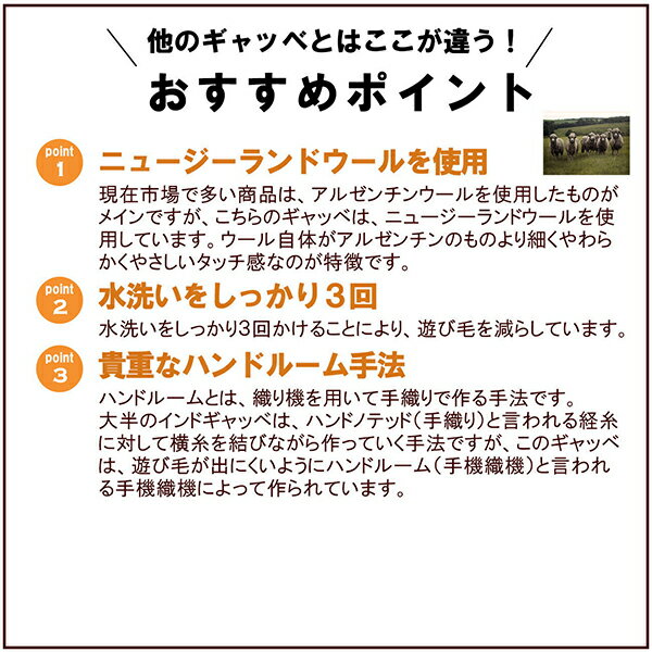 現在市場で多い商品は、アルゼンチンウールを使用したものがメインですが、こちらのギャッベは、ニュージーランドウールを使用しています。
